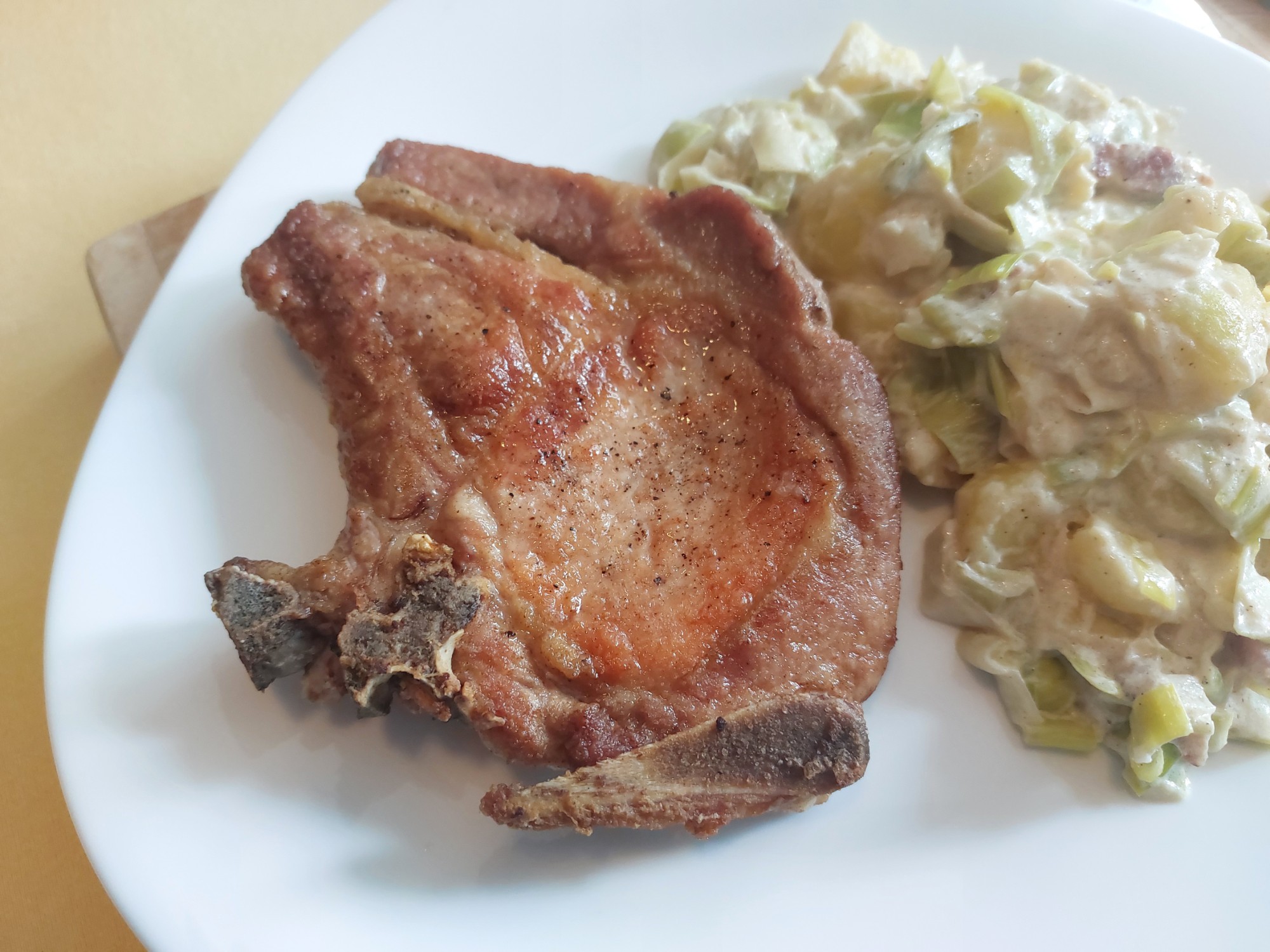 Während der Fisch im Öfchen wärmte und buk, kam in eine Pfanne etwas Butter, Bauchspeck, Knoblauch und Schalotte und wurde angeschmurgelt. Die letzten drei Sachen waren gewürfelt, was bei der Butter auch wenig sinnvoll ist, da sie in der Pfanne sowieso schmolz. In Streifen geschnittener Spitzkohl ergänzte den Pfanneninhalt, dazu kamen Salz, Pfeffer, Kümmel und eine Spur Chili für den Pfiff. Als der Kohl zusammen gefallen war, kamen die gekochten Kartoffelstücke dazu und wurden beim Einrühren auch noch ein wenig zermanscht. Ein wenig Flüssigkeit war nämlich in der Pfanne entstanden bzw. zugegeben. Letzteres in Form eines Schusses Apfelsaft (mit Birne).