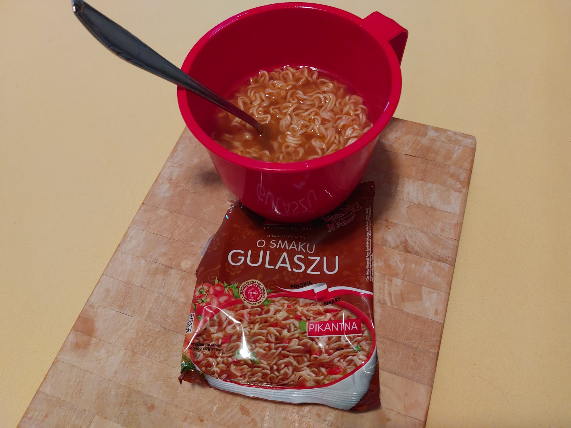 Weniger witzig war eine Entdeckung, die ich neulich mal im Discounter des Tages machte – ich weiß schon gar nicht mehr, in welchem. Ihr kennt ja die quadratischen Tütchen mit den fernöstlichen Instand-Nudeln. Nudeln in eine große Tasse/Schale, Inhalt der beigelegten Tütchen dazu, kochendes Wasser drauf, ziehen lassen, fertig. Aus vielen Aspekten heraus nicht so der große Bringer. Aber ein vietnamesischer Hersteller in Zusammenarbeit mit einem polnischen Vertrieb dachte dann mal an die Europäer und ihre kulinarische Geschichte.