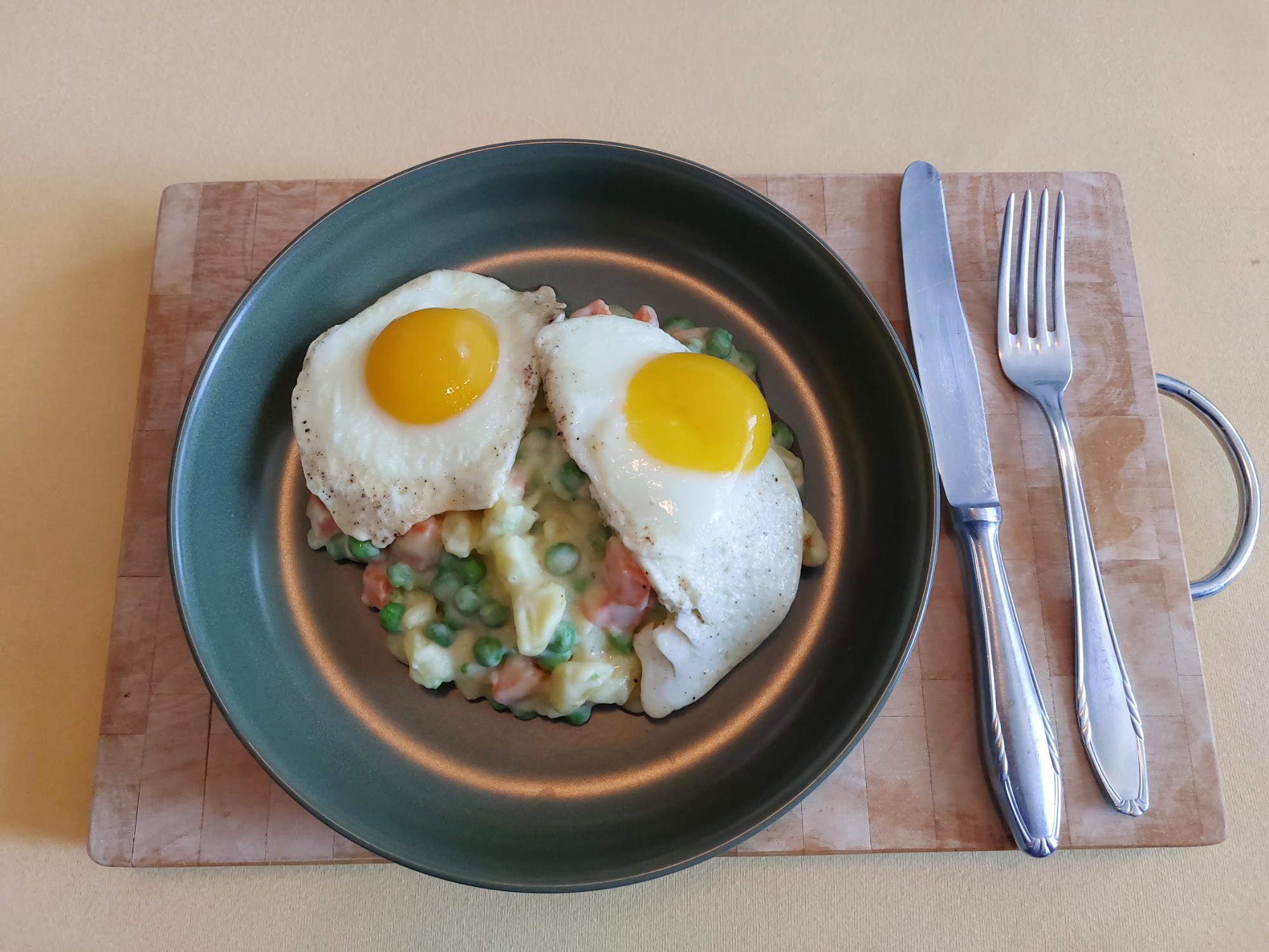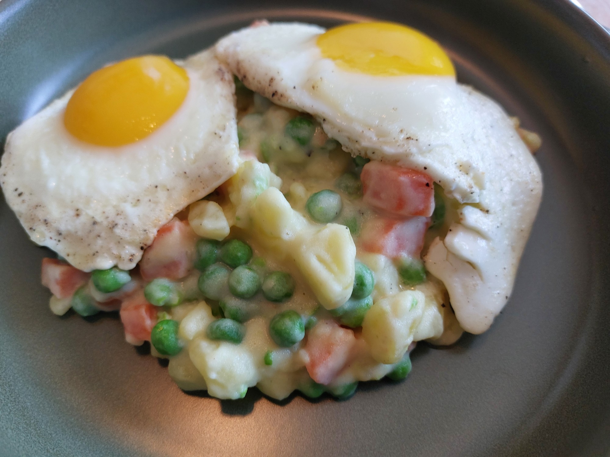 Unter den Spiegeleiern ist ein Kartoffel-Möhren-Erbsen-Gemenge. Mehligkochende Kartoffeln wurden geschält und gewürfelt, eine Möhre auch und beides wurde in der Mikrowelle gegart. Kurz vor Ende kamen die Tk-Erbsen dazu. Nicht eine der besseren Ideen. Nach der Garung wurde gewürzt (Salz, Pfeffer, Muskat) und mit Sahne vermengt. Und dann wurde mit der Gabel gerührt und gerührt und gerührt und gerührt … bis die Sahne zusammen mit den sich leicht auflösenden Kartoffeln eine Bindung entstehen lässt. Ursprünglicher Plan war, Kartoffeln und Möhren zu einem Stampf zu verarbeiten – mit besagter Sahne – und dann die Erbsen dazu zu geben … Aber was sind schon Pläne?!