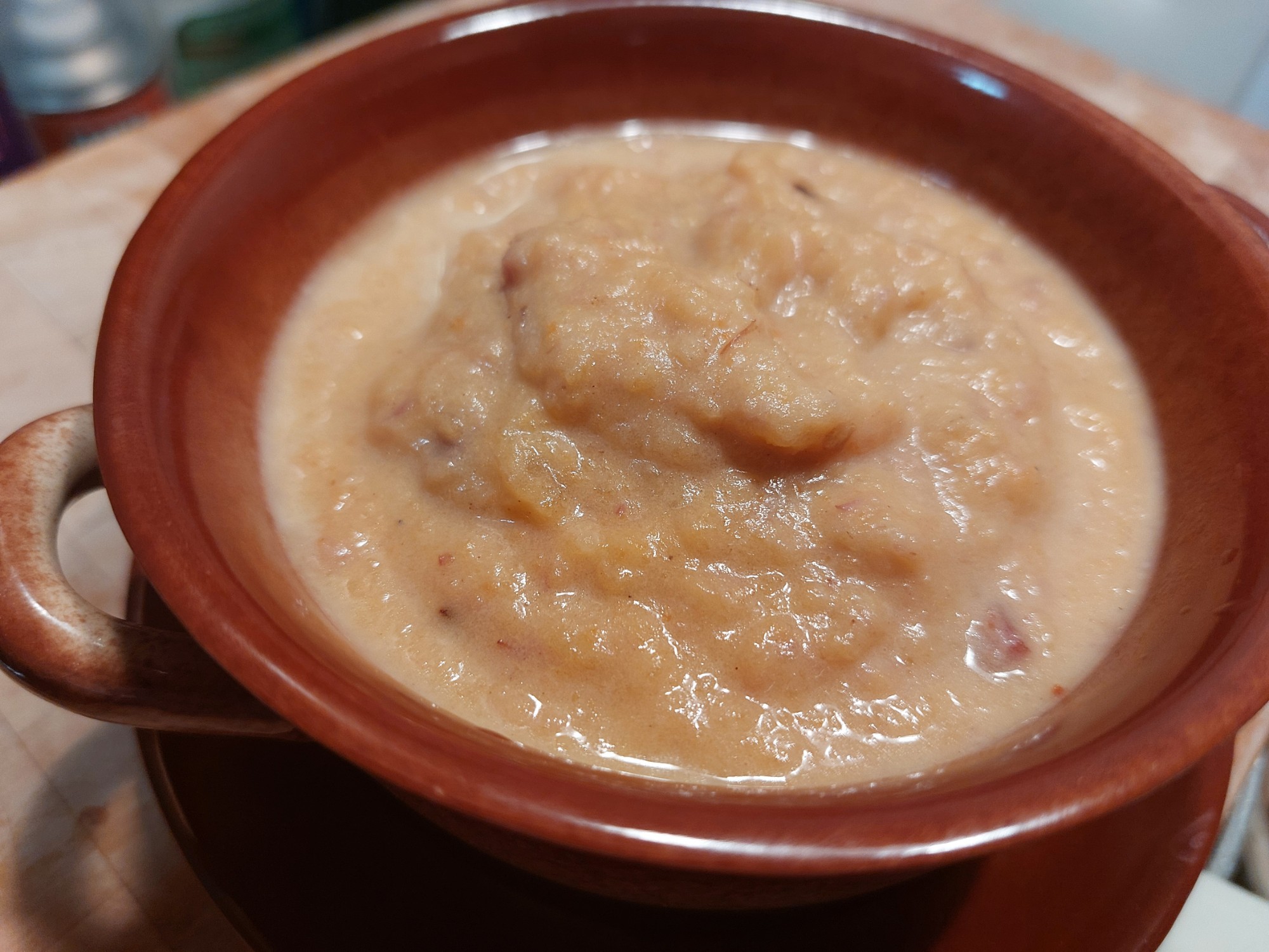 Einen Namen gibt’s nicht. Im Hinterkopf schwebte „Suppe“, die Konsistenz ging vielleicht doch eher in Richtung Brei, bei der Farbe passt Pamps vermutlich auch. Basis waren „Brühwürfel“, die ich als einzige wirklich guten Herzens akzeptieren kann: Geräucherter Bauchspeck, in Würfel geschnitten, mithilfe von etwas Butter ausgelassen, und mit einer ebenso gewürfelten Schalotte aromatisch ergänzt. Dazu kamen – nachdem etwas Bräunung in den Topfboden einzog – eine kleine gewürfelte Wruke/Steckrübe, ein paar gewürfelte Kartoffeln und eine gescheibviertelte Möhre. Alles wurde mit etwas Wasser aufgegossen, gerade so, dass es sichtbar wurde, aber nicht alles bedeckte. Das Gemüse musste nun erstmal unter Anwesenheit von Salz und Pfeffer garen. Anschließend habe ich den Topfinhalt pürierstabt, mit etwas Chili, weiterem Salz und Pfeffer abgeschmeckt und so lange mit Milch aufgegossen, bis es halbwegs cremig war. Zur „Erfrischung“ kamen noch ein paar Spritzer Apfelessig dazu, wer hat, nimmt Zitrone.