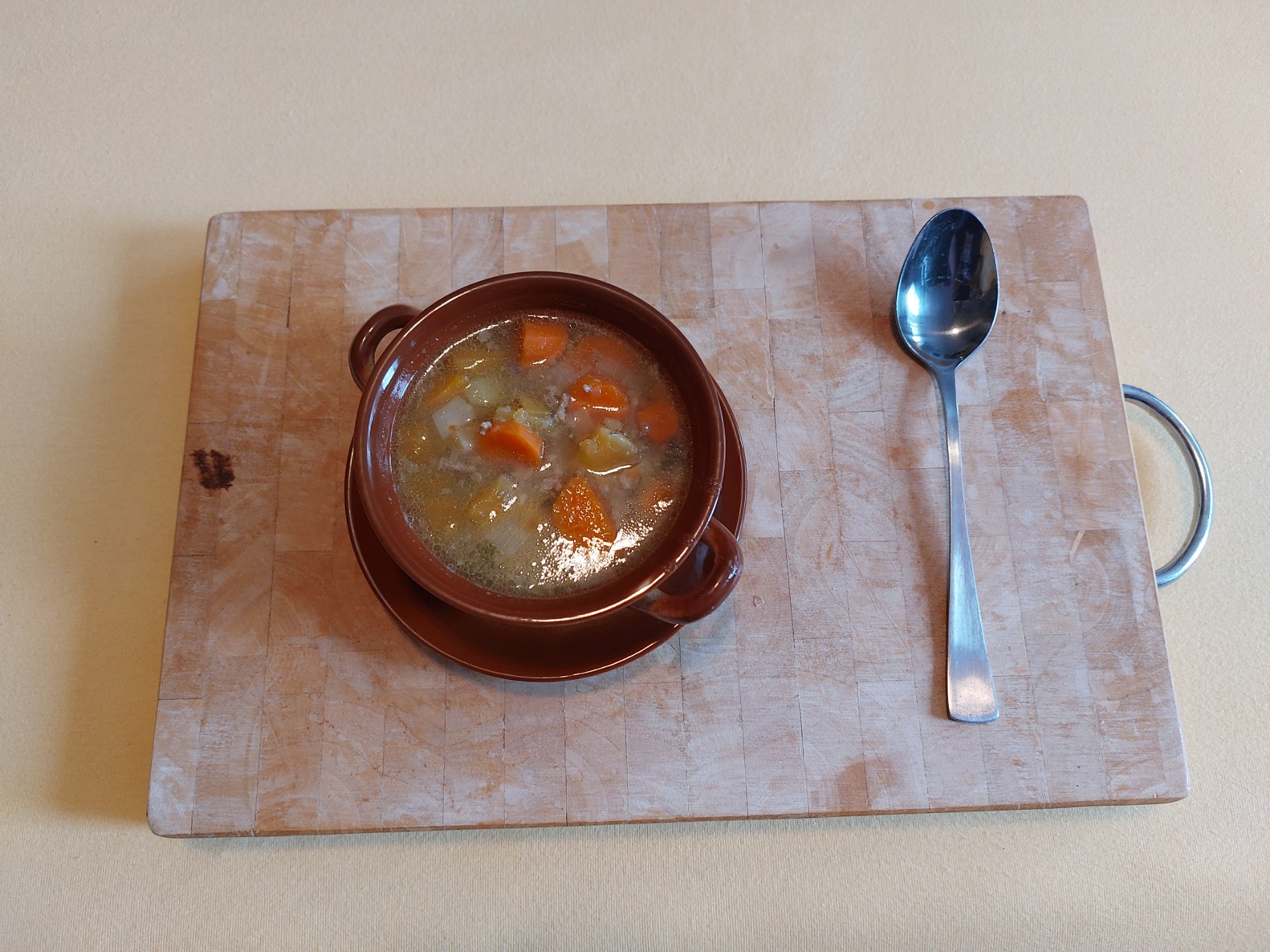 Wrukeneintopf auf Hackfleisch/Markknochen-BasisDer ganze Kochvorgang dauerte dann doch etwas länger als ich dachte, zusammen mit dem Schnibbeln sowieso, aber das ziehen der Brühe war entfallen, was sicher auch ein bis zwei Stunden einsparte.