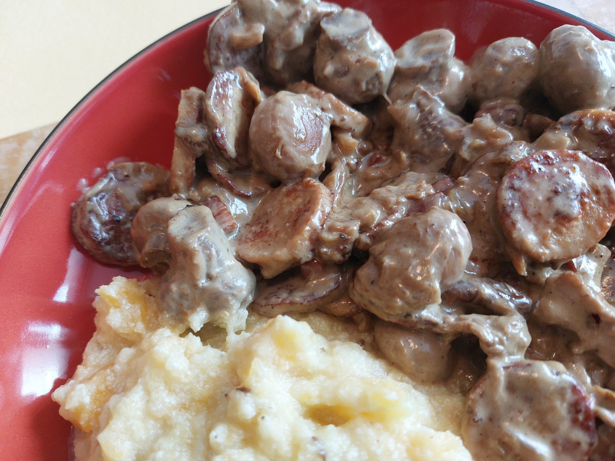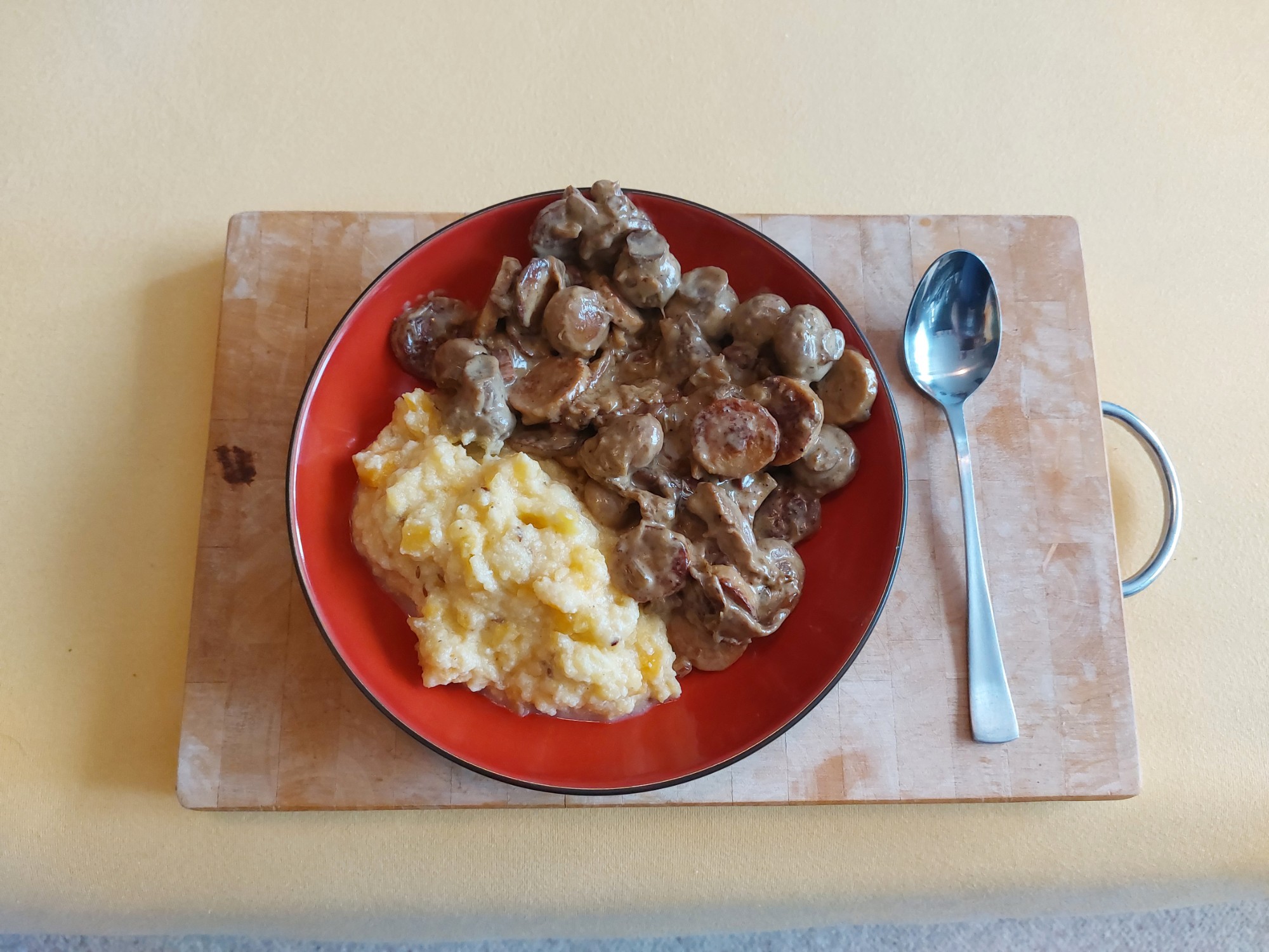 Dosenchampignons (auch wenn 1. Wahl drauf steht) und getrocknete Steinpilze, bei denen es gut tut, dass es drauf steht, weil erkennbar ist es nicht, sind nicht so meine Ware, aber intensiv weiterverarbeitet oder als Einlage in einem Schmorgericht kann man das man benutzen. Achja, und Bratwurst wird wohl auch nie so richtig meins sein, aber gut angebraten, dass wirklich nix weißes mehr zu sehen ist, geht’s. Alles zusammen war durchaus schmackhaft und einmal muss ich es auch noch essen. Die Hälfte der Soße ist schon im Kühlschrank. Die gibt’s morgen zusammen mit Reis.