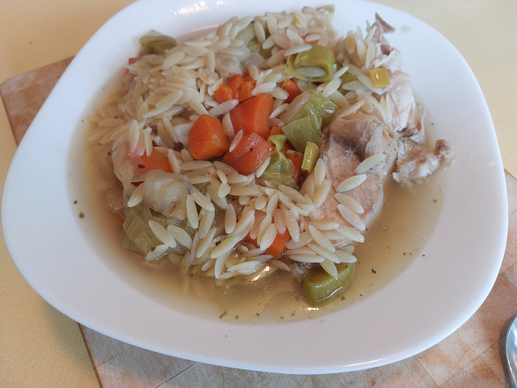 Sind wohl ein bisschen viel Kritharaki geworden, zumindest auf dem Teller. Aber das kommt dabei heraus, wenn der letzte Arbeitsschritt dann doch etwas aufwändiger wird. Brühe in einen zweiten Topf abschöpfen, darin die Nudeln garen, und dann alles auf einem Teller wieder vereinen, wobei das Huhn noch etwas auseinander genommen werden muss. Ich koche die Nudeln deswegen nicht im großen Topf mit, da ich die immer nur bei der Portion dabei mache, die auch gerade gegessen wird. Liegt die Nudel zu lange in der warmen Brühe, wird daraus gern mal ein herzhafter Nudelpudding mit aufgequollener Teigware. Lecker, aber im schlimmsten Fall recht trocken.