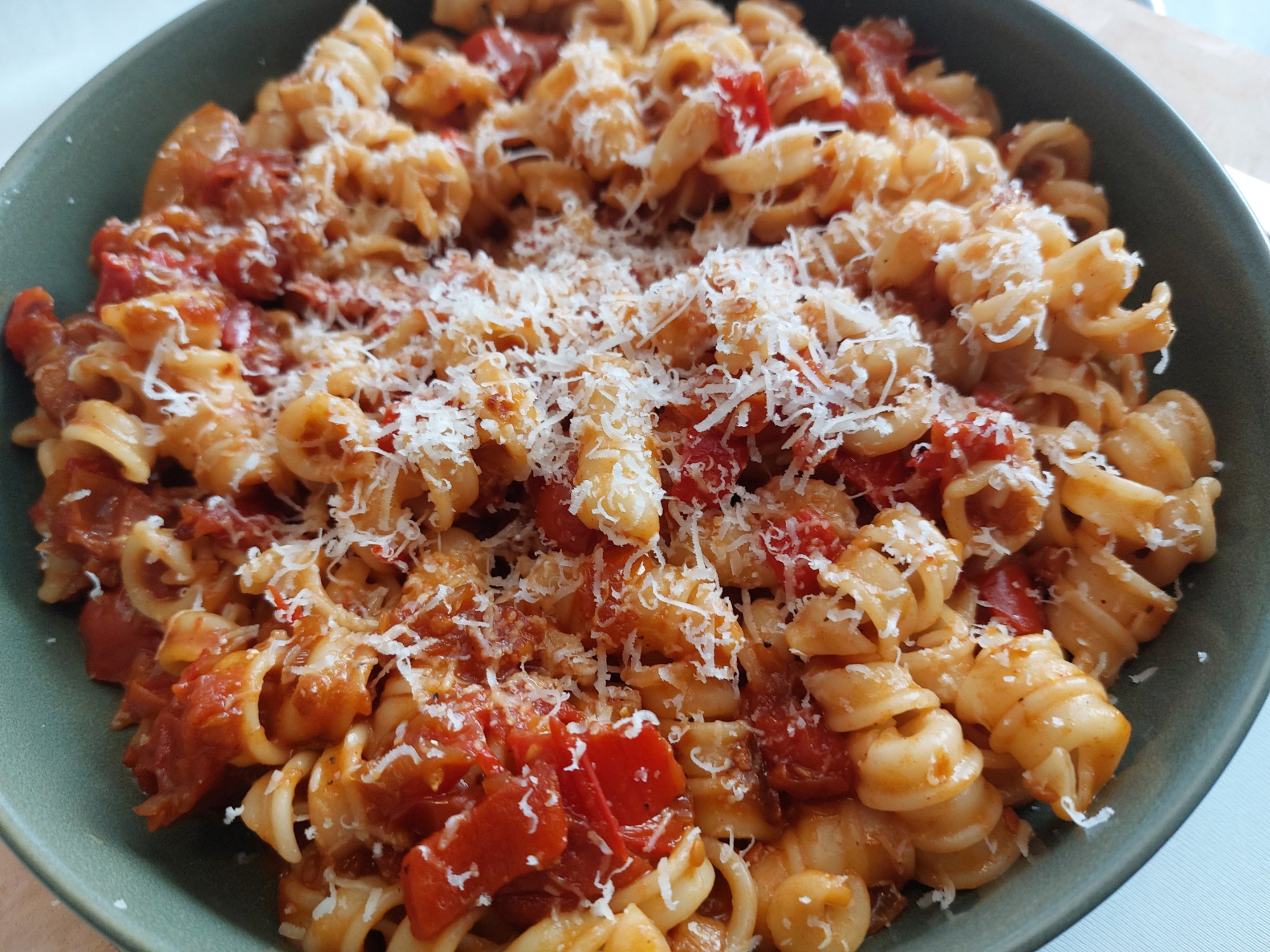 Nebenbei kann dann irgendwann (nach 20-30 min.) das Nudelkochwasser aufgesetzt und die Pasta gekocht werden. Kurz vor der Zugabe der fertigen Teigwaren kommt noch etwas geriebener Parmesan in die Soße, die auch noch mit etwas Pfeffer aufgepeppt werden kann. Dann kann angerichtet werden.