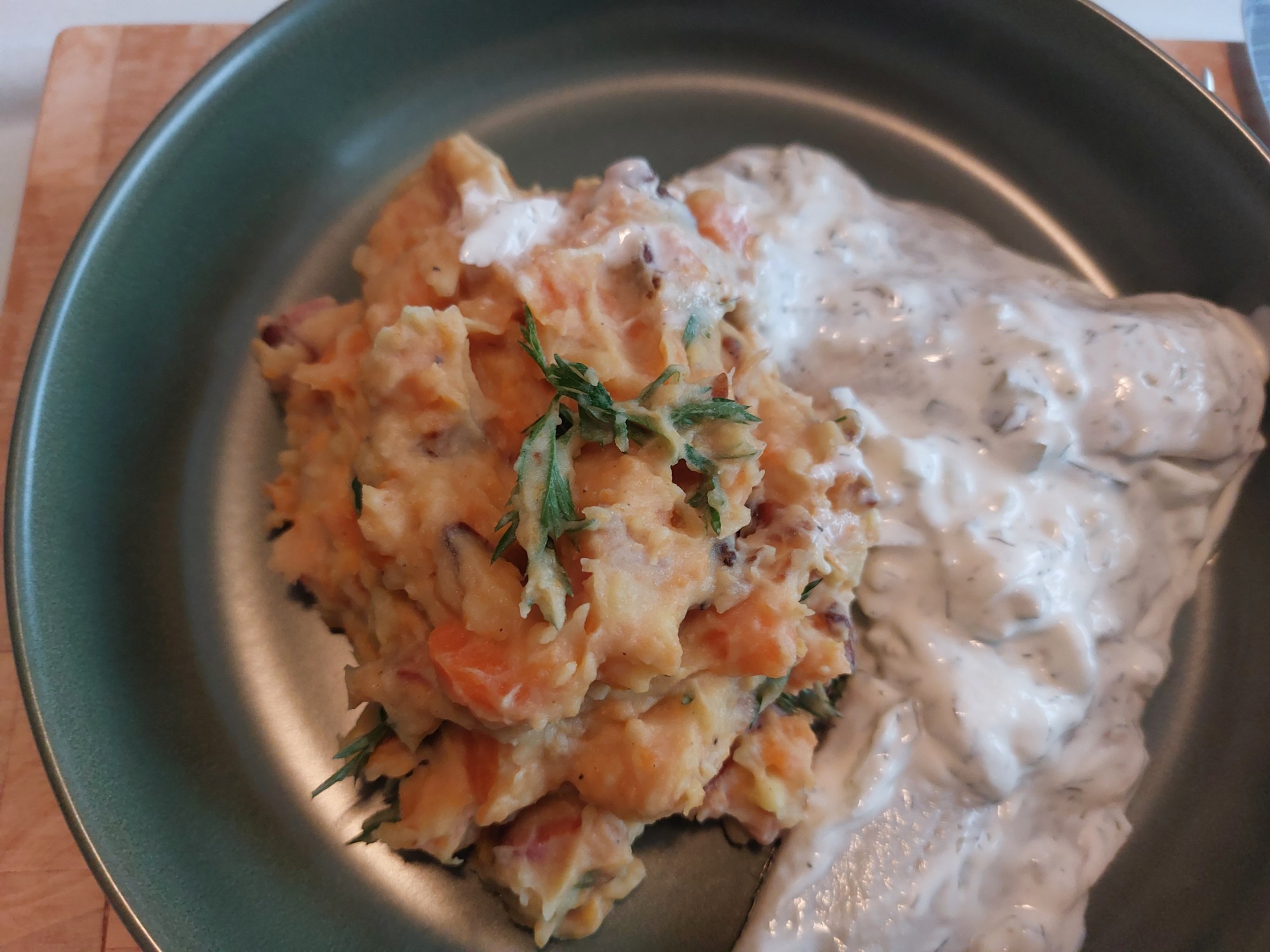 Gewürfelte Kartoffel und gescheibte Möhre im Verhältnis von ca. 2:1 wurden im Dampf über ein wenig gesalztem und gerosmarintem Wasser gegart. Nebenher garten ein paar grob geschnittene Schalotten, etwas Knoblauch und ein paar Kleinquader Südtiroler Specks in einer Pfanne. Als die Möhren-Kartoffel-Mischung weich war, wurde sie in Anwesenheit von etwas Milch und Butter gestampft, mit dem Pfanneninhalt verrührt und mit Salz, Pfeffer und Muskatnuss abgeschmeckt. Zum Abschluss kam noch etwas Möhrengrün – grob gezupft – mit hinein. Dann konnte angerichtet werden.