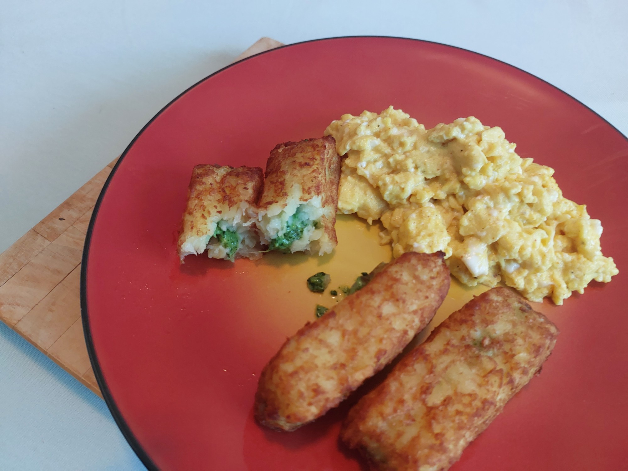 Aus dem heimischen (und vorher dem ladenöffentlichen) Tiefkühler kamen drei Kartoffeltaschen, frisch aufgebacken, auf den Teller, die mit einer Mischung aus Spinat und Mozzarella (lt. Packungsaufdruck) gefüllt waren. Dazu verquirlte ich drei kleine Eier mit etwas Milch, Salz, Pfeffer und Kurkuma und briet daraus ein Rührei. Fertig.