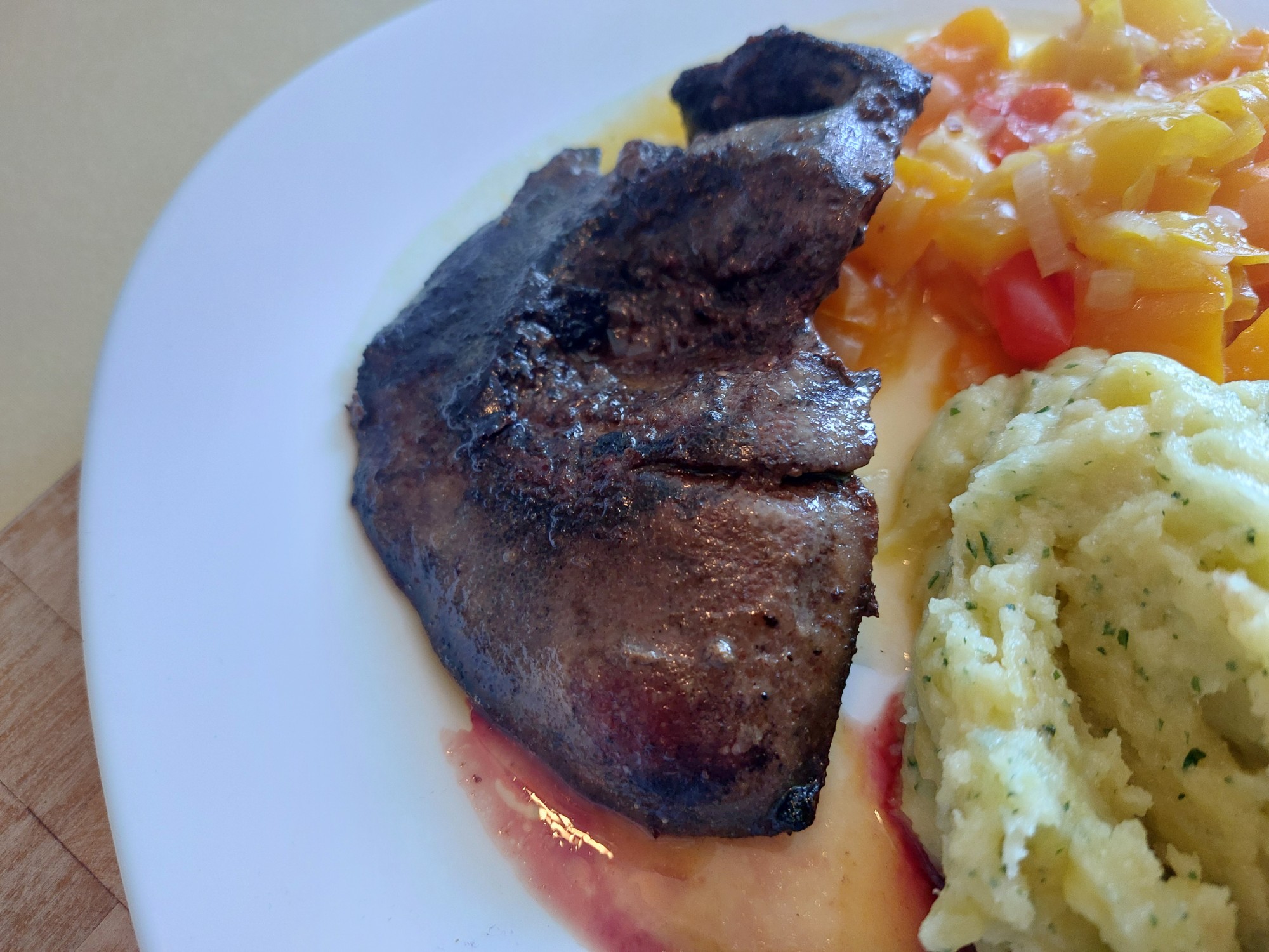 Stampfkartoffeln, Paprikagemüse, LeberLeber vom Schwein, Paprikagemüse und die 2432. Version von Stampfkartoffeln, diesmal auf eine Art, die ich so noch nie gemacht hatte, mit einem ganz neuen Ergebnis. Durchaus empfehlenswert. Wobei auch die Leber eine kleine Neuheit ist für mich, da ich sie sonst noch nie zubereitet hatte, wenngleich auch schon öfter mit Genuss gegessen.